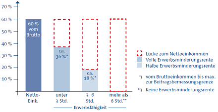 Die Lücke zwischen Ihren Ansprüchen und Bedürfnissen ist so groß, dass nur eine private Berufsunfähigkeitsversicherung diese schließen kann. Ihr Vorteil außerdem: Eine volle Rente auch bei 50% Arbeitsfähigkeit und Verzicht auf abstrakte Verweisung (⇒)!